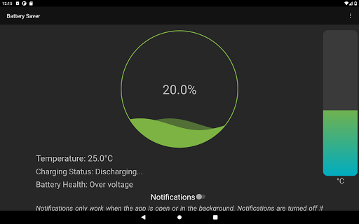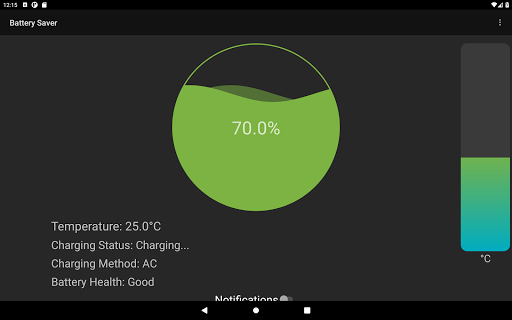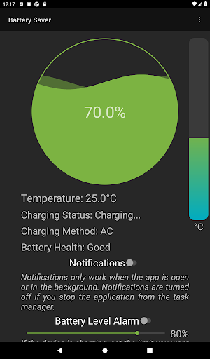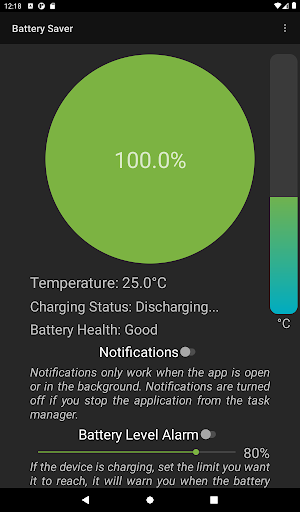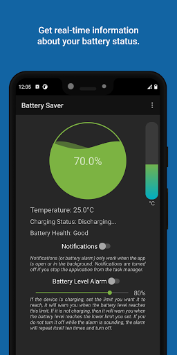 Batarya Saver APP size aşağıdaki bilgileri sağlayabilir: ➤ Sıcaklık değeri ➤ Batarya Sağlığı ➤ Şarj yöntemi ➤ Şarj durumu ➤ Pil seviyesi alarmı ➤ Bildirimler Bu uygulama 'değil Kişisel Verileri , ' değil internet .