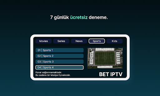 BET IPTV'nin ne sunduğunu merak mı ediyorsunuz? Cömert 7 günlük ücretsiz denemeyle risksiz deneyin. Kaydolun ve size hiçbir maliyet olmadan geniş bir kanal ve içerik seçkisine erişim sağlayın. Uygulamayı keşfedin, yeni şovlar bulun ve neden IPTV yayını için BET IPTV'nin tercih edilen seçenek olduğunu kendiniz görün.
