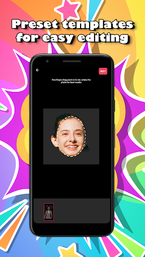 Sadece bir fotoğraf yüklemeniz gerekir ve uygulama yüzünü yakalayacaksınız. Fotoğraf ve video şablonuna yükleyin, yüzünü bir çizgi film karakterinin gövdesi ile değiştirerek, ilginç yüz değiştirmeyi kolaylaştırır.