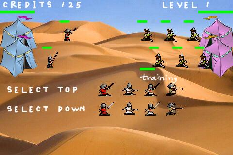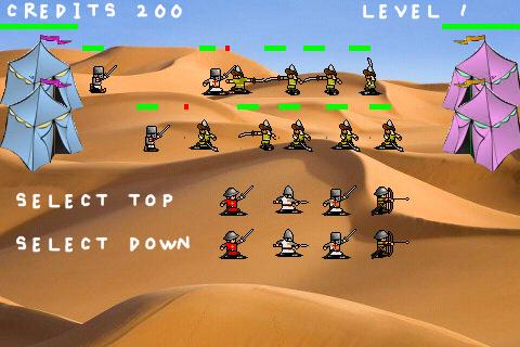 Knights battle knights in medieval war.\nKnights in medieval warfare. An addictive game of strategy & tactics.\nTrain your knights [on the Left] and send them to battle the enemy army [on the Right]. The Objective is to destroy the enemy Camp.\nThe battle takes place on 2 fronts - top and down.\nEarn enough credits to deploy the following units:\n* Rookie Knights [ 5 credits ] \n* Spear Knights [ 10 credits ] \n* Experienced Knights [ 20 credits ] \n* Archers [ 40 credits ]\nCredits are incremented by 20 every few seconds (experience points) and also added for each enemy killed.\nStrategy & Tactics:\n1. Deliberately fight prolonged battles in the lower levels so as to collect as many credits as possible. Use these credits to your advantage in the upper levels to deploy more archers and experienced knights. Be careful about deploying too many archers in the early levels as this can wipe out your credits.\n2. Try to quickly capture at least half the battle field. This gives you a strategic advantage as it prevents enemy from releasing many knights which can be deadly especially if they are archers.\n3. Archers are very powerful when grouped, where they can release an almost continuous stream of arrows This is how you win the higher level battles.\nProvides hours and hours of fun and pure enjoyment. Play KNIGHTS WAR today!\nTablet Ready.