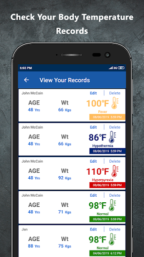 Vücut Sıcaklığı Uygulaması sadece birden fazla formda değer giremez, aynı zamanda veri görüntüleyebilir. Grafiklerin şekli ve daha sonra izleyebilir. Bu uygulama, vücut sıcaklığınızı kolayca uygun bir yerde analiz etmeyi kolaylaştırır. Vücut sıcaklığı kayıtlarınızı, diyagramlar ve grafikler tarafından otomatik olarak oluşturularak tamamlanmıştır. Aylık, haftalık ve yıllık raporlarınızı da oluşturabilir. Normal vücut sıcaklığı, yaş, cinsiyet ve iklim koşulları gibi faktörlere bağlıdır. Normal vücut ısısı, Celsius ölçeğinde 37.5 derece Santigrat ve 97.7 derece Fahrenheit, Fahrenheit Ölçeğinde 99,5 derece Fahrenheit'e kadar 37.5 derece Celtius'dur. Doğru yiyecek ve içecek hareketi ve kıyafetleri vücut sıcaklığınızı yükseltebilir. Ancak normal vücut sıcaklığınızı korumak çok önemlidir.