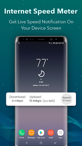Internet Speed Meter displays your internet speed in status bar and shows the amount of data used in notification pane.