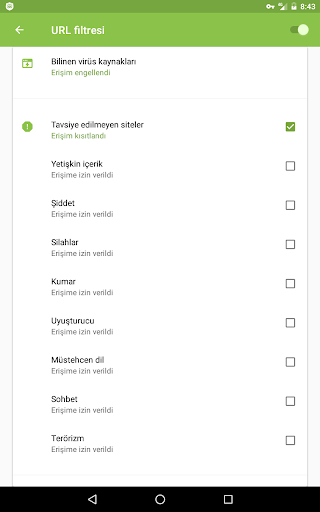 • Çeşitli tematik web sitesi kategorileri (uyuşturucular, şiddet vb.) için engelleme mümkündür.