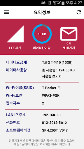 - 포켓파이A 정보를 한눈에 볼 수 있습니다. (T 포켓파이 전화번호, LTE 신호세기, 데이터 사용량 등)