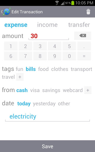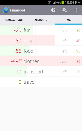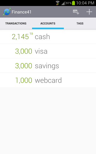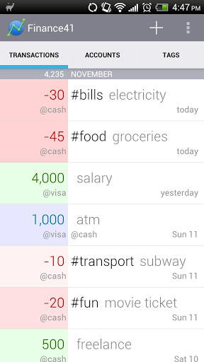 Great personal finance app that keeps track of your spending, income and savings. Refreshingly simple, quick and easy to use.You can use it offline, it will sync online automatically when possible.Note: this is not a stand alone app, it is backed up by Finance41.com. All financial information is synchronized online, and can be accessed from your computer's browser presenting the bigger picture.Provides widgets for:- account balances - check your balances from the home screen- add transaction - quickest add transaction experienceMoney is kind of important, it should be monitored. Finance41 helps you:- keep track of your money, - manage your expenses, income and transfers from one account to another - see your accounts balances- set budgetsThe app is designed to be extremely simple, easier to use than an Excel spreadsheet, but also very powerful.Finance41.com, the web app, offers all the features you need:- recurrent transactions- large, insightful charts- money accounts and tags editing- transactions that need to be confirmedand more.Also you can install the Finance41 Chrome extension, to add transactions and check your finances without leaving your current tab.Take control of your finances!Keywords: expense manager, expense management, expense tracker money manager, personal money manager, savings tracker, saving money, finance, finance manager, personal finance, financisto, personal finance manager, personal finance management, personal money management, budget manager, budget tracker, budget planner, spending tracker, daily expense tracker, expensify, daily expense manager, income tracker, income calculator, mobile banking, savings account, checking account, receipt tracker, receipt scanner, receipt filer, receipt capture, expense log, household budget, family budget, financial planner, smart financial calculator, accounting, finance, accounting software, business accounting, cash register, cash organizer money, money saving app, money saver, easy money, pocket money, mint, checkbook, book keeping, book keeper, mobile expense tracker, mobile money app, mobile money manager