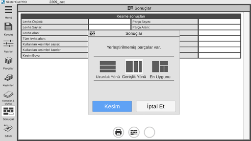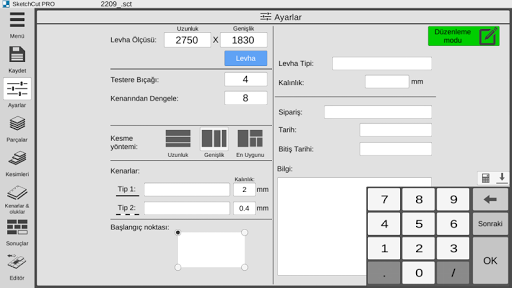 -levha ölçüsü, testere diş kalınlığı, kenar boşlukları vb kesim parametrelerini seçme ve değiştirebilme;