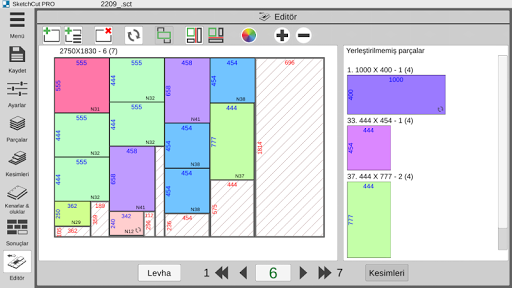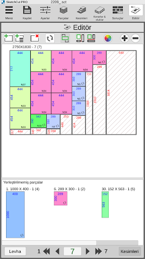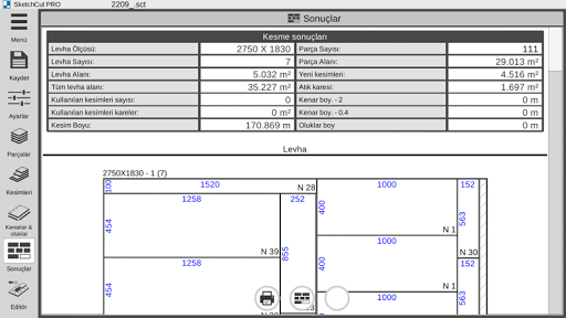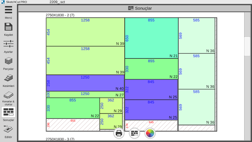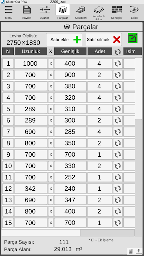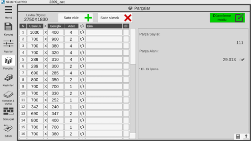 - parçaların ve bölümlerin otomatik hesaplanması, kesim genişliği ve kenar genişliği;