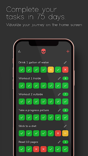 75 Hard, bireylerin 75 zor mücadeleyi tamamlamasına yardımcı olmak için tasarlanmış bir araçtır.Fitness programını yaparken günlük görevlerinizi takip etmenize yardımcı olur.Disiplin, irade ve güçlü bir zihniyet geliştirmenize yardımcı olacaktır.