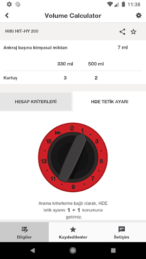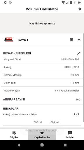 Hilti Volume Calculator sayesinde profesyonel uygulamalarda doğru ve tutarlı kimyasal dübel sarfiyat hesabı yapabilirsiniz. Bu sayede şantiyenizde ihtiyacınız olan miktarda kimyasal dübeliniz her zaman elinizin altında olur! Çalışma koşullarınıza göre detayları ayarlayarak hesaplamayı kendi projenize uygun yapabilirsiniz.