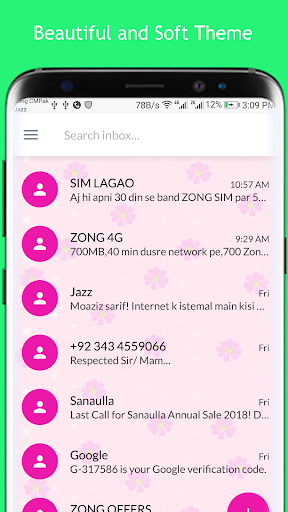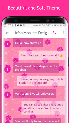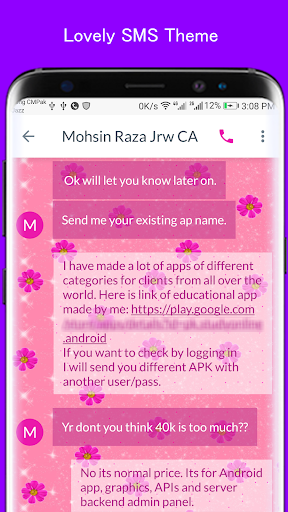 Pink SMS Theme allows you to read incoming and outgoing messages on white and pink bubbles with beautiful pink background.