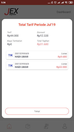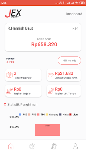 Dashboard : Menyajikan informasi total pengiriman paket, jumlah ongkos kirim yang sedang berjalan, serta tagihan yang berjalan maupun yang jatuh tempo.