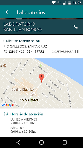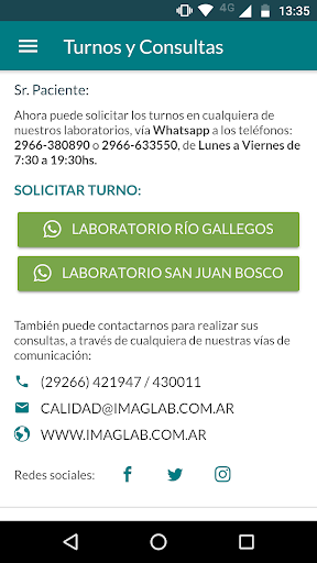 * Turnos y consultas: la aplicación posee un acceso directo al número de WhatsApp para solicitar turnos.