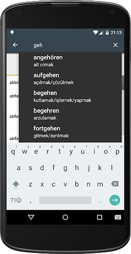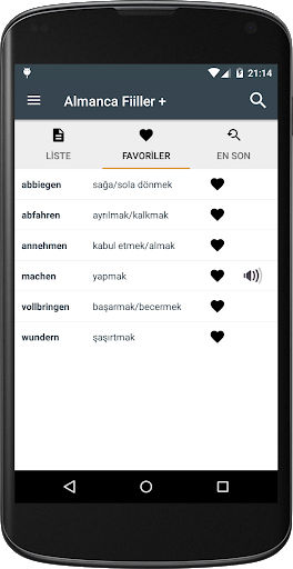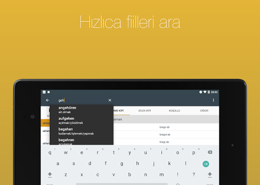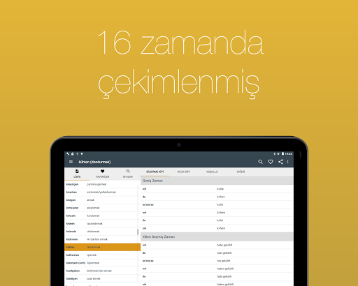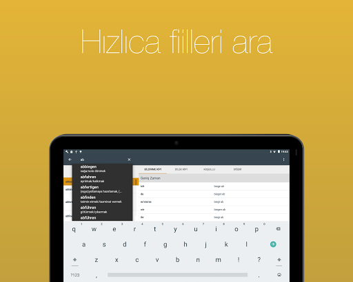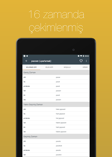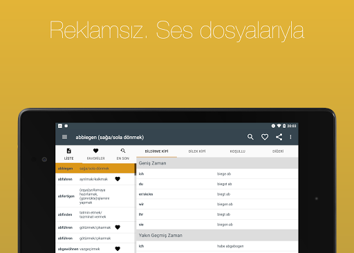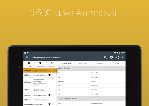 16 zamanda 1500'den fazla Almanca fiili görüntüleyin. Basit gezinme ve yerleşik arama sayesinde ihtiyacınız olan fiili saniyeler içinde bulabileceksiniz.