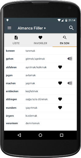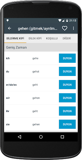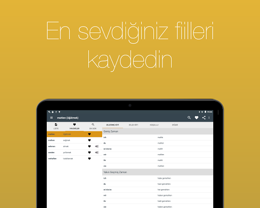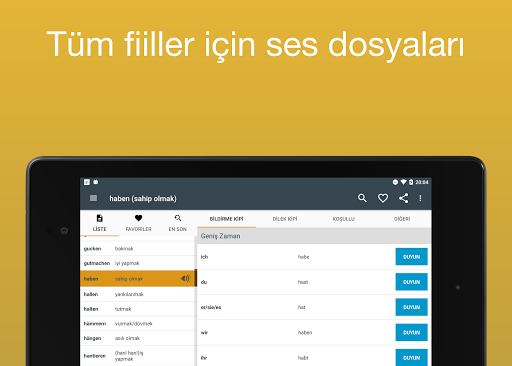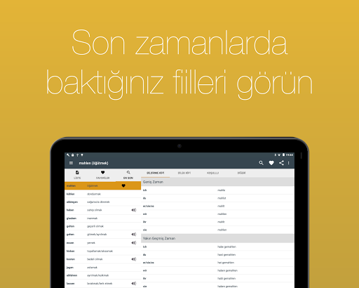 Artık sesli!! Fiilin nasıl telaffuz edildiğinden emin değil misiniz? Tek yapmanız gereken fiili çekiminin yanındaki düğmeye dokunmak. Dikkat: bu işlev için İnternet bağlantısı gereklidir.