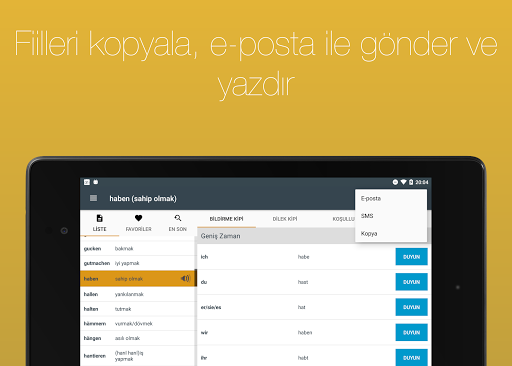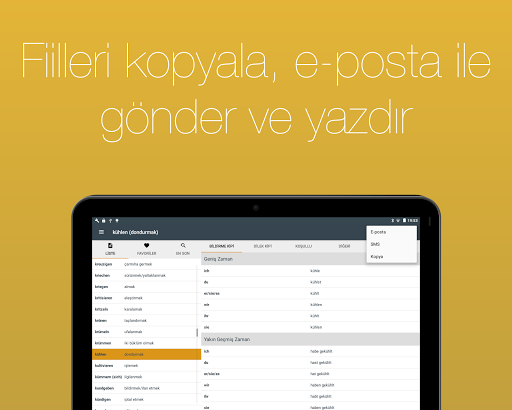 Fiilleri kopyalama, e-posta yoluyla gönderme ve yazdırma olanağı bulunmaktadır.