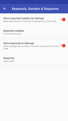 Bu uygulama, sizinle iç çevreniz arasında gerçekleşmesi gereken sosyal etkileşimleri korurken, ne yapılması gerektiğine odaklanmanızı sağlar.Bu, bir odak dönemi aralıkları ve kırılma süresinin aralıklarını tahsis edilerek yapılır, böylece yanmazsınız.Ek olarak, bu uygulama, onlardan ve / veya anahtar kelimeleri içeren mesajların size ulaşabileceğinden emin olmak için öncelikli gönderenleri ve / veya önemli anahtar kelimeleri filtreleyebilir.