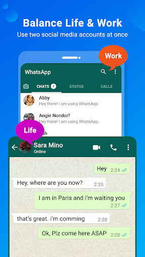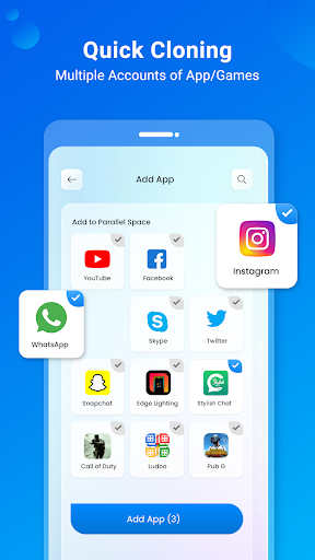 Parallel klon uygulamaları Yardım Kullanıcılar aynı uygulamada birden fazla hesap oluşturur. Kullanıcılar aynı anda birden fazla hesap çalıştırabilir ve bunlarla güvenli bir şekilde geçebilir. Paralel Uygulama, kullanıcıların çok çeşitli popüler sosyal, mesajlaşma ve oyun uygulamalarını birden fazla hesapla aynı anda klonlamalarına izin verir. Cihaz.