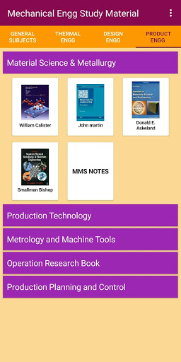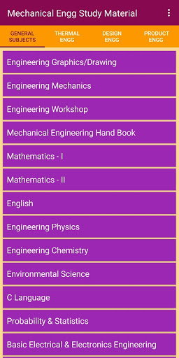 This app provides B.Tech 1st year, 2nd year, 3rd year and 4th year mechanical books and notes. It has separate tabs for general subjects, thermal, design and production engineering subjects.