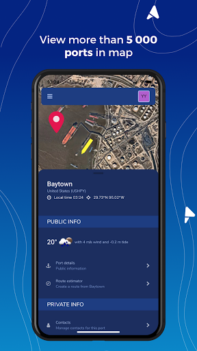 Port merkezinde, 5'ten fazla bilgi bulacaksınız, gelgit, hava durumu, bunker fiyatları, ve mevcutluk ve şu anda limanlarda ve son ayrılışlarda bulunan gemilerde. Fotoğraflar, belgeler, çizimler ve iletişim bilgilerini özel bilgileriniz olarak ekleyebilirsiniz.