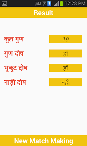 Match Making gives you the result of How many gun are matched. If you are satisfied that the gun are matched perfectly then please get the opinion of your astrologer for kundli analysis. Because this app match the Gun and not analyse kundli of Boy and Girl.
