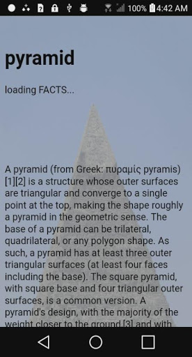 A pyramid (from Greek: πυραμίς pyramis)[1][2] is a structure whose outer surfaces are triangular and converge to a single point at the top, making the shape roughly a pyramid in the geometric sense. The base of a pyramid can be trilateral, quadrilateral, or any polygon shape. As such, a pyramid has at least three outer triangular surfaces (at least four faces including the base). The square pyramid, with square base and four triangular outer surfaces, is a common version.
