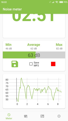 Noise meter, decibelometer, measure sound level Advanced noise meter: *Saving results *Real-time graph view and in result's details *Avarage, min and max level of noise *Import and export database *Calibration *Audio saving