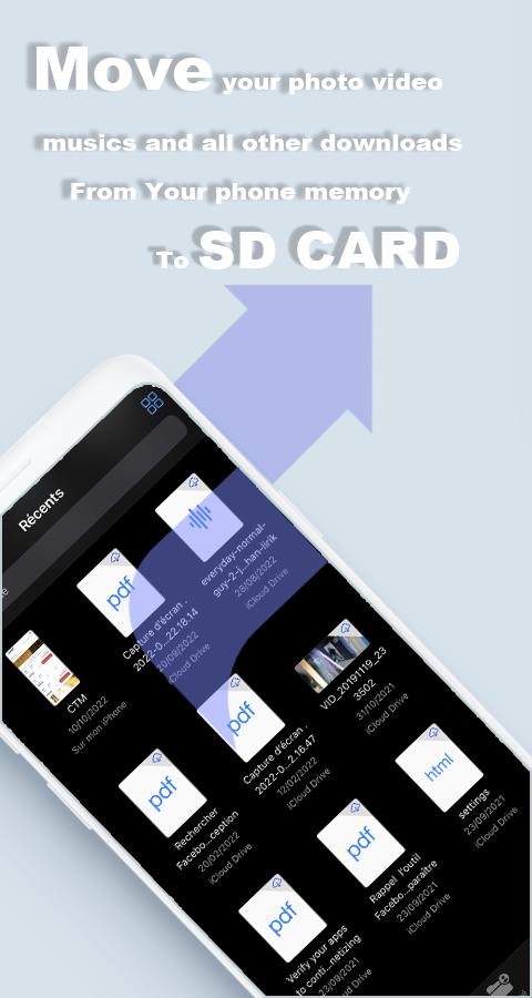 Move to sd card application that allows you to move files to the SD card as well as move the application to the SD card. Move your photos, videos, music, Zip files and all other downloads from your phone's memory to the SD card.
