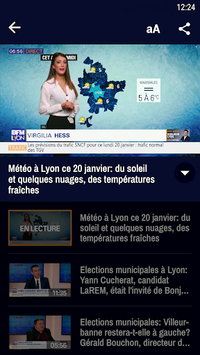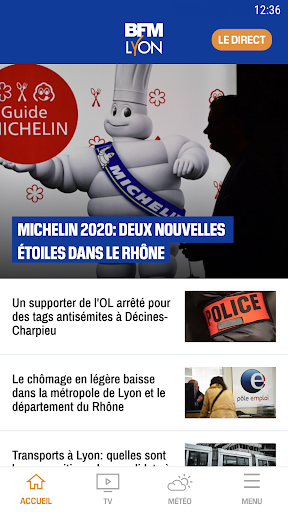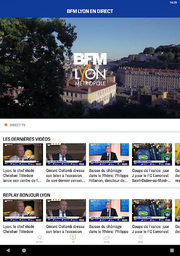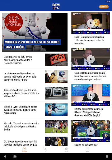 "Sekme çubuğundan" (ekrandan altta bulunur), farklı konuları bulun: ✓ BFM Lyon'un yazılarının seçilmesini, makalelerle ve Videolar ✓ "TV" BFM Lyon'u başlatmak için "TV", herhangi bir zamanda yaşayabilirler