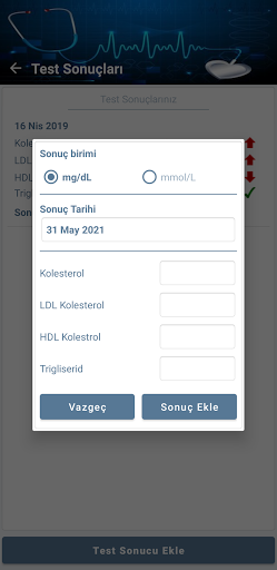 - Lipid Panel test sonuçlarınızı (Kolesterol, Trigliserit, LDL ve HDL Kolesterolleri) saklama, düzenleme ve silme