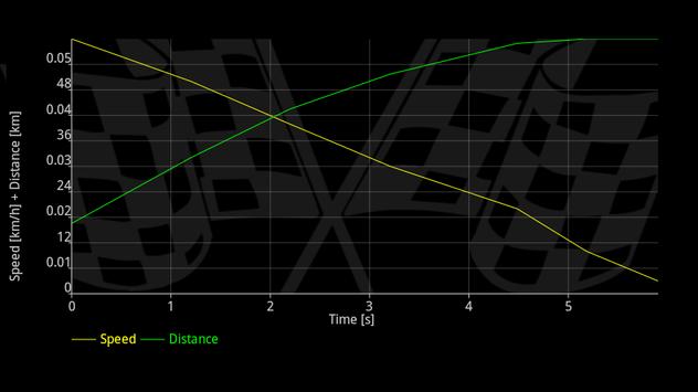 Draging and braking tests use automatic start-stop and write the measured speed and distance data on the chart. Accurate approximation algorithms are used on devices with slow GPS update rate.