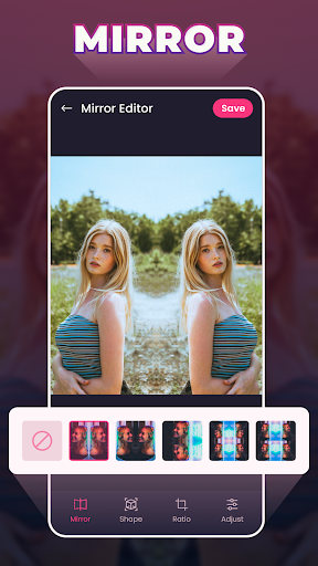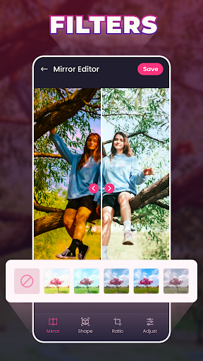 🌈 Ayna Etkileri: Fotoğraflarınıza derinlik ve simetri eklemek için çeşitli ayna efektlerini keşfedin.Büyüleyici yansımalar oluşturmak için görüntülerinizi çevirin, döndürün ve çoğaltın.