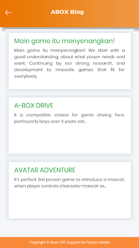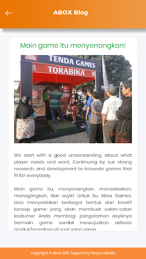 “Crowd-maker”. Demikian julukan ABox di antara klien-klien kami. Tak heran. Sejak 2007 kami telah berhasil menggaet puluhan juta orang ke acara bellow-the-lines peluncuran produk dan brand ternama sebagai mitra bisnis di seluruh Indonesia. Semua berkat puluhan games Arcade yang kami rancang dan produksi sendiri di workshop kami di Jakarta.