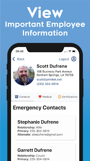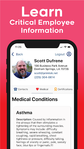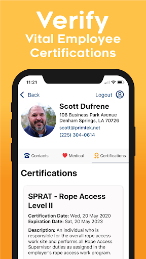 Using the mobile app, users can scan employee QR codes to view employee basic information, emergency contacts, medical conditions and certifications.