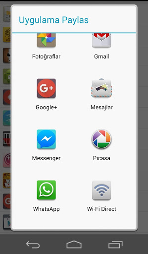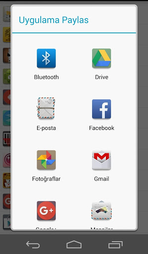 Paylaşmak istediğiniz uygulamanın üzerine tıklayarak Bluetooth,facebook,google araçları,whatsapp ile paylaşabilirsiniz.