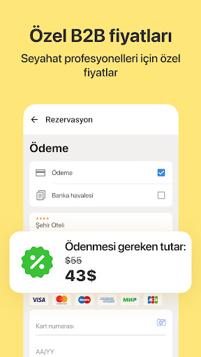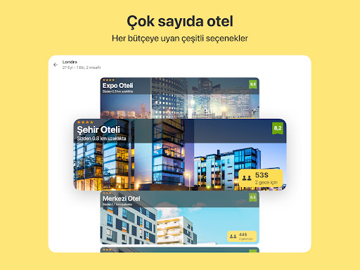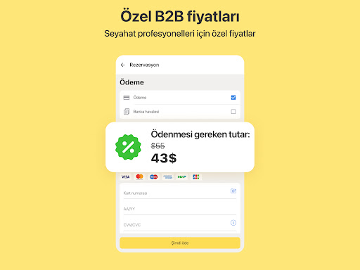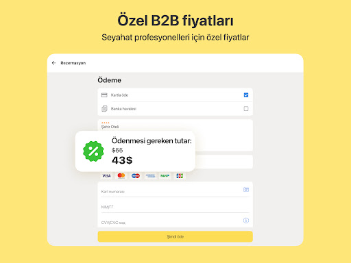 Kurumsal müşteriler ve seyahat acenteleri için, 1.300.000'den fazla otel, misafirhane, pansiyon ve daire arasından uygun fiyatlarla seçim yapabilirsiniz. Büyük küresel envanter tedarikçileri ve on binlerce otelle doğrudan çalışıyoruz. Bu size en iyi fiyatları sunmamızı ve paranızı tasarruf etmenizi sağlar.