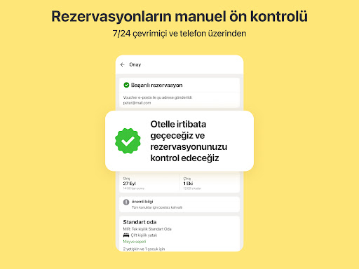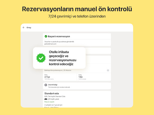 Maksimum güvenilirliği garanti ediyoruz. Müşterilerinizin otelde beklendiğinden emin olabilmeniz için, tüm rezervasyonların manuel olarak ön kontrolünü yapıyoruz ve her rezervasyonun detaylarını otelle tekrar kontrol ediyoruz.