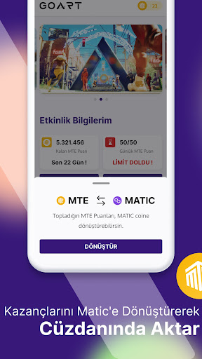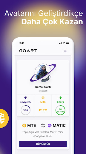 Artırılmış Gerçeklik teknolojisinden yararlanılarak ve Move To Earn ( Harekete Geç ve Kazan) konsepti odağında oluşturulan GoArt Metaverse; sanal dünyaya saklanmış milyonlarca MTE puanını, sürpriz ödül sandıklarını ve NFTleri toplayarak kripto para kazanmak isteyen herkesi zamanda yolculuğa davet ediyor!