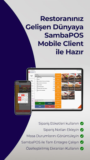 SambaPOS Mobile Client garsonlarınızın kalem ve kâğıt kullanmadan sipariş almasını sağlar. Sipariş alma hızını artırdığı gibi sipariş karışıklıklarının da önüne geçer. Masa sipariş takibini anlık olarak sahip oldukları mobile cihazlardan yapabilen garsonlarınız, müşterilerinizle daha verimli iletişim kurabilecektir.