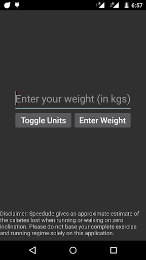 Disclaimer: Speedude gives an approximate estimate of the calories lost when running or walking on zero inclination. Please do not base your complete exercise and running regime solely on this application.