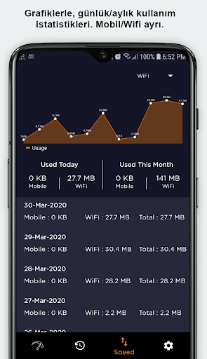 SpeedTest ile internet hızınızı ölçün, anlık internet kullanımınızı her daim statü çubuğunda görün, test geçmişinizi kontrol edin, aylık ve günlük internet kullanım verilerinize ulaşın (wifi için ayrı, mobil internet için ayrı).