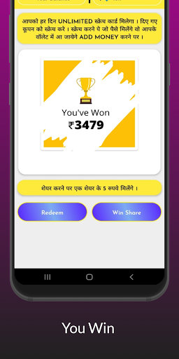 Scratch Cards Are Depends On The User's Luck. Points In Cards Opens Randomly. In Scratch and Win Real Cash App You Will Get Unlimited Scratch Cards In Whole Days