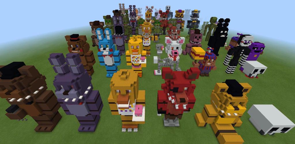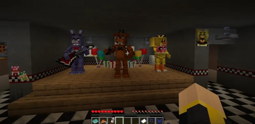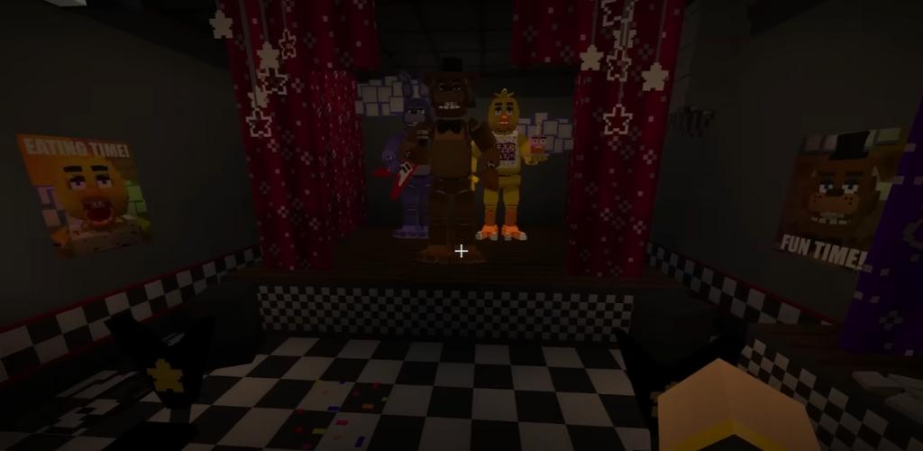 Welcome to the world of Minecraft Pixel. If you are looking for a scary or horror game then our app Animatronics mod for MCPE of five nights at freddy's is just what you need. Here you will have fnaf mods and maps and skins. This is a very cute addition to MCPE, because here you will find yourself in a pizzeria where characters in animatronic costumes from five nights at Freddy's walk around. FNAF is a fun and scary game where you will meet your favorite characters, including Freddy Fazbear.