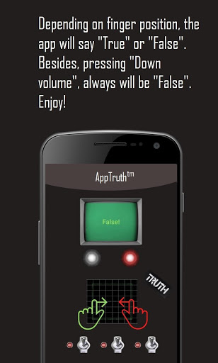 "AppTruth, The Lie Detector" is a lie detector simulator. It is an app to check if someone is lying. Well. Really not. We have a trick to get when it is true or not. Just, change the position of the finger on the "detector button" and the app will say if "It´s true" or "It´s false". But, nobody knows it! If your friend want to press, keep pressing "Down Volume" while he is doing the question and pressing the button and the app will always show "False!". Check our Play Store section to get help.