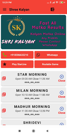 Shri Kalyan-Online Matka Play apps provide live results and fastest matka app in the world. For every market we publish game early in our app and these are the few game names time bazar, rajdhani day, milan day, kalyan, milan night, rajhdhani night and mainMumbai etc. Basically we publish more than 35 matka market games results.