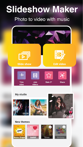 Create video slideshows using photos, songs and effects with Photo Video Slideshow Maker . It includes an incredible photo to video movie maker tool that enables you to create lovely, romantic, sad, happy, and a variety of other interesting slideshows, perfect for Instagram, Facebook or Twitter. You can make, modify, and export videos from your photo gallery, and share them on social media platforms. This digital slideshow app is one of the most effective photo to video creator apps.