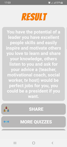 - Sınavı düzenli olarak güncelliyoruz. Kariyer testi hakkında sınav daha sonra lütfen 5 yıldız derecelendirin ve paylaşın. Gelecekte böyle daha fazla sınav yapmaya motive etmek için incelemenizi yazmayı unutmayın. BR> Her görüşü dinliyoruz.
