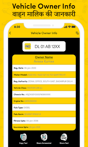 Just enter vehicle number to get over a dozen vehicle registration details including real owner name, age, registration date, insurance expiry, etc.