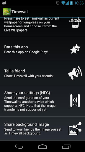 Canlı duvar kağıdı ayarlarınızı NFC ile arkadaşlarınızla hızlı bir şekilde paylaşabilirsiniz, sadece cihazlarınızın arkasına dokunarak (yalnızca ALAN COMUNITİKASYONUN YAKINDA DESTEKLEME GÖRÜNTÜLERİ İÇİN: SAMSUNG GALAXY NEXUS, NEXUS S, NEXUS 4, GALAXY S3 , Galaxy S4, Xperia SP, Xperia L, HTC One, LG Optimus G, vb ...)