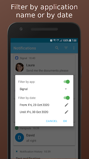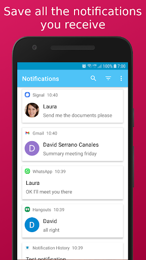 Telefonunuzda alınan tüm bildirimler yüklediğiniz andan itibaren kaydedilecektir.bu uygulama.Uygulamayı açtığınızda, kaydedilen tüm bildirimlerle kronolojik sırayla sunulacak, bildirim günlüğünüzü gözden geçirmek için aşağı kaydırabilirsiniz.Arama çubuğuna bir terim tanıtmak için aradığınız bildirimi kolayca bulabilirsiniz.Kayıtlarınızı uygulamaya ve/veya belirli bir zaman aralığına göre filtreleyebilirsiniz.Tüm bu alanların kombinasyonu, tüm günlüğünüzde herhangi bir bildirim bulmanıza izin verecektir.alır, bir kişinin hatayla reddedilmesi önemli değildir;Uygulamayı açabilirsiniz ve izlemeniz için orada olacak.Bildirim girişine basarak başlatılan uygulamayı hızlı bir şekilde açabilirsiniz.Bu geçmiş günlük uygulamasıyla yayınlanan tüm bildirimleri gözden geçirin.