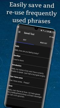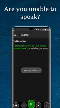 Geçici veya kronik olarak konuşamıyor musunuz? Yakın zamanda boğazınızla ilgili bir ameliyat geçirmişseniz veya gırtlak iltihabından (larenjit) muzdaripseniz, konuşmanız mümkün değildir. "ReadOut!" çevrenizdeki insanlarla olan iletişiminizde size güvenilir bir şekilde yardımcı olacaktır. Sık kullanılan metinleri kaydedin ve hepsini Android cihazlarınız arasında eşleştirin (Premium Özellik).